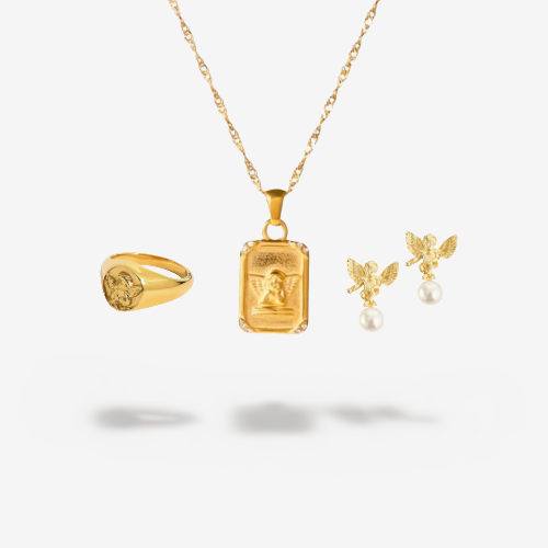 Der Name Divine Trinity steht für Harmonie, Schutz und zeitlose Eleganz. Das Set vereint drei Stücke, deren himmlisch inspirierte Details eine ruhige, kraftvolle Ausstrahlung tragen – feine Strukturen, sanfte Formen und ein Hauch sakraler Ästhetik. Jedes Teil erzählt seine eigene Geschichte und verbindet klassische Symbolik mit moderner Raffinesse.
