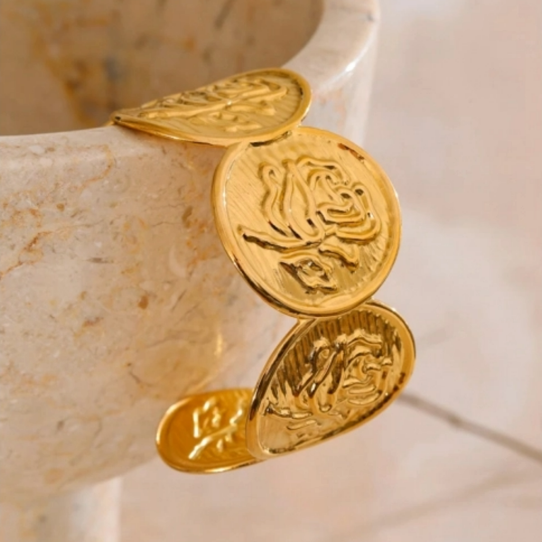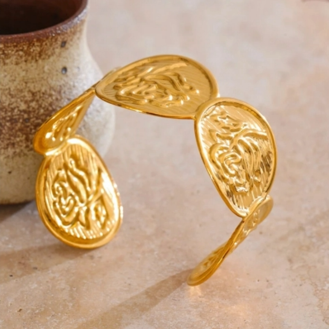 Der Name Rosara leitet sich von Rosa, dem lateinischen Wort für Rose, ab und verkörpert die zeitlose Schönheit und Stärke dieser Blume. Der Rosara-Armreif vereint Eleganz und Ausdruck – seine fein geprägten Rosenmotive erzählen von Anmut, Wachstum und innerer Kraft.